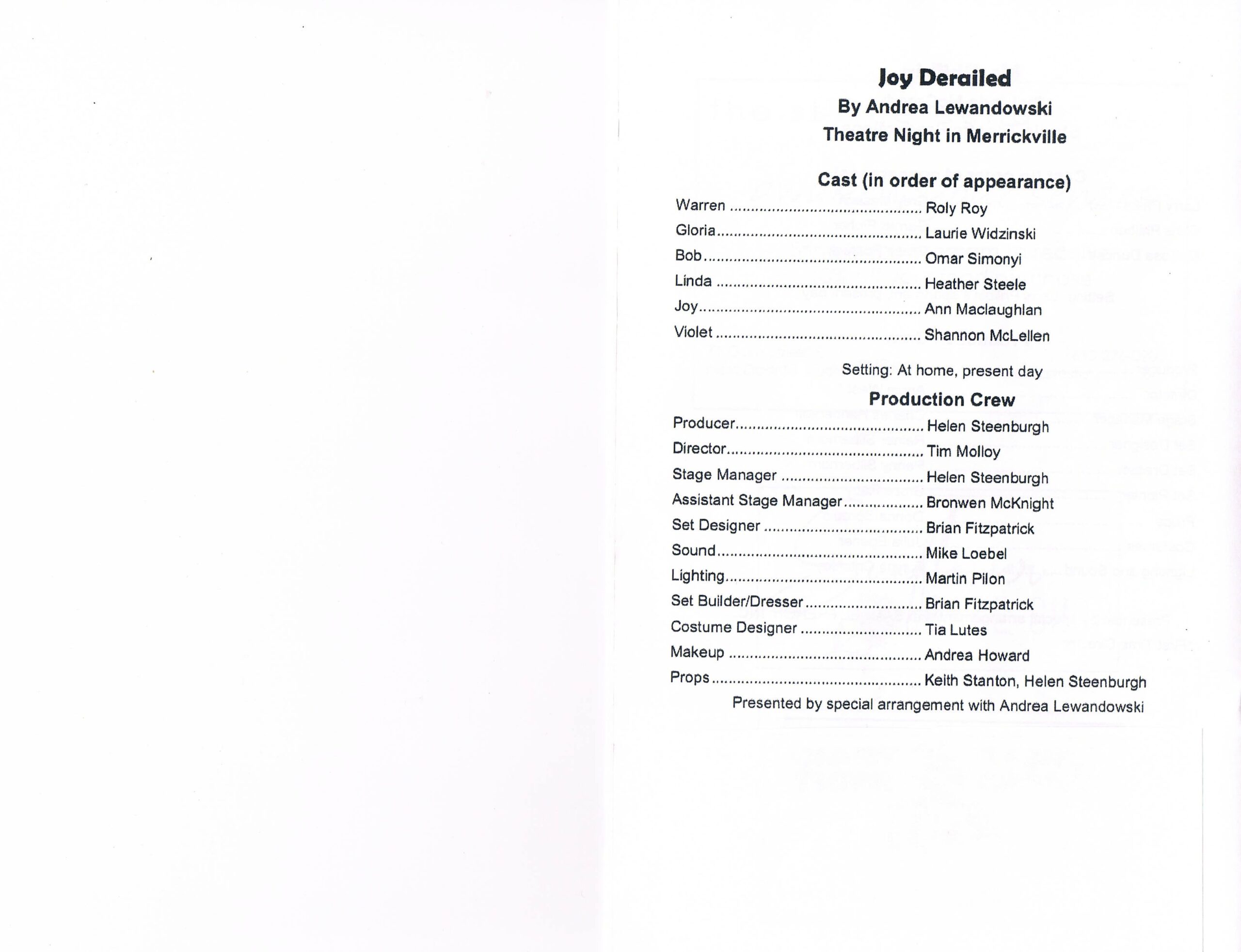 Was presented as our entry at the Eastern Ontario Drama League One-Act Festival in Perth on November 8th & 9th 2019. The cast and crew of Joy Derailed did us